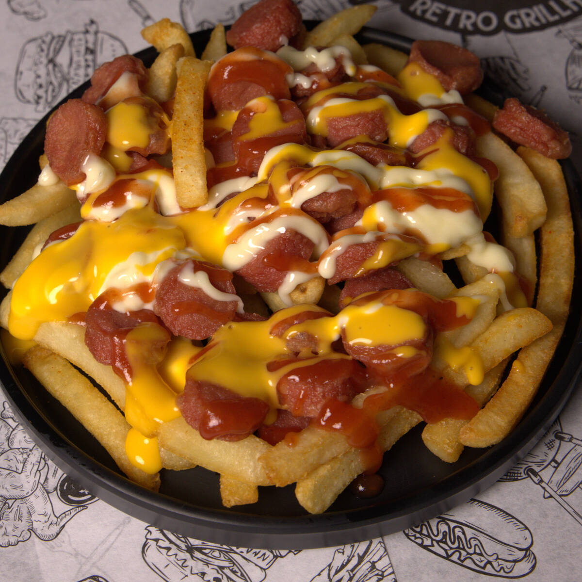 200 g De papas francesas servidas con salchichas troceadas y una selección de aderezos, los cuales son cátsup, mayonesa, mostaza y queso cheddar.