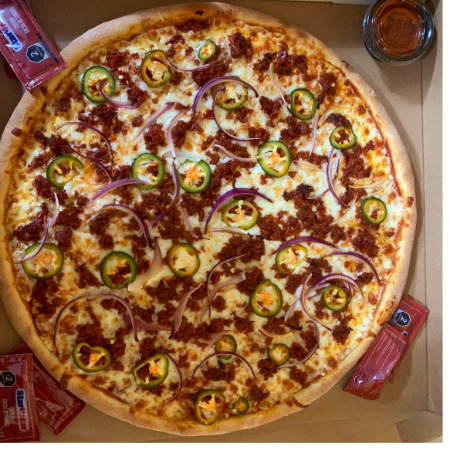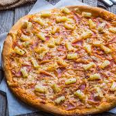 Salchicha, jitomate, jamon, piña, queso de hebra, cebolla caramelizada y aderezo.