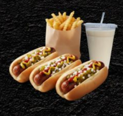 3 Hot dogs clásicos, 1 orden de papas a la francesa y 1 bebida a elegir.