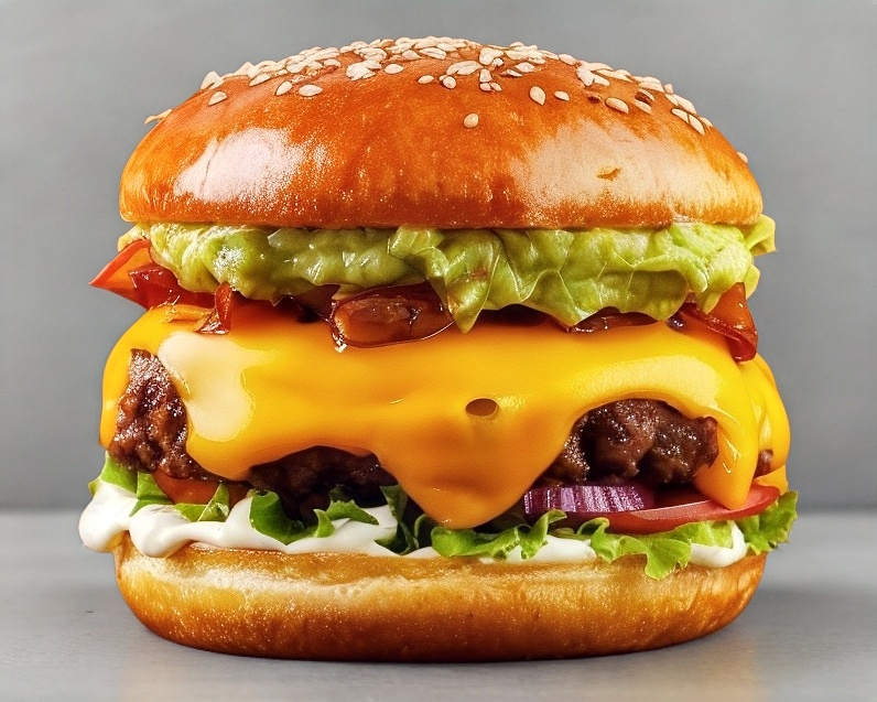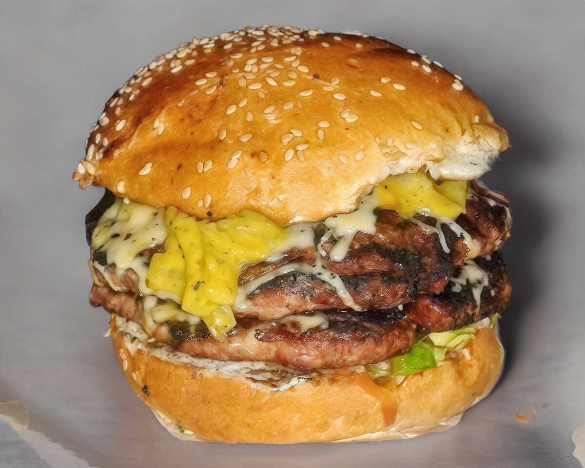 Hamburguesa con doble Carne queso manchego y americano pepinillos cebolla