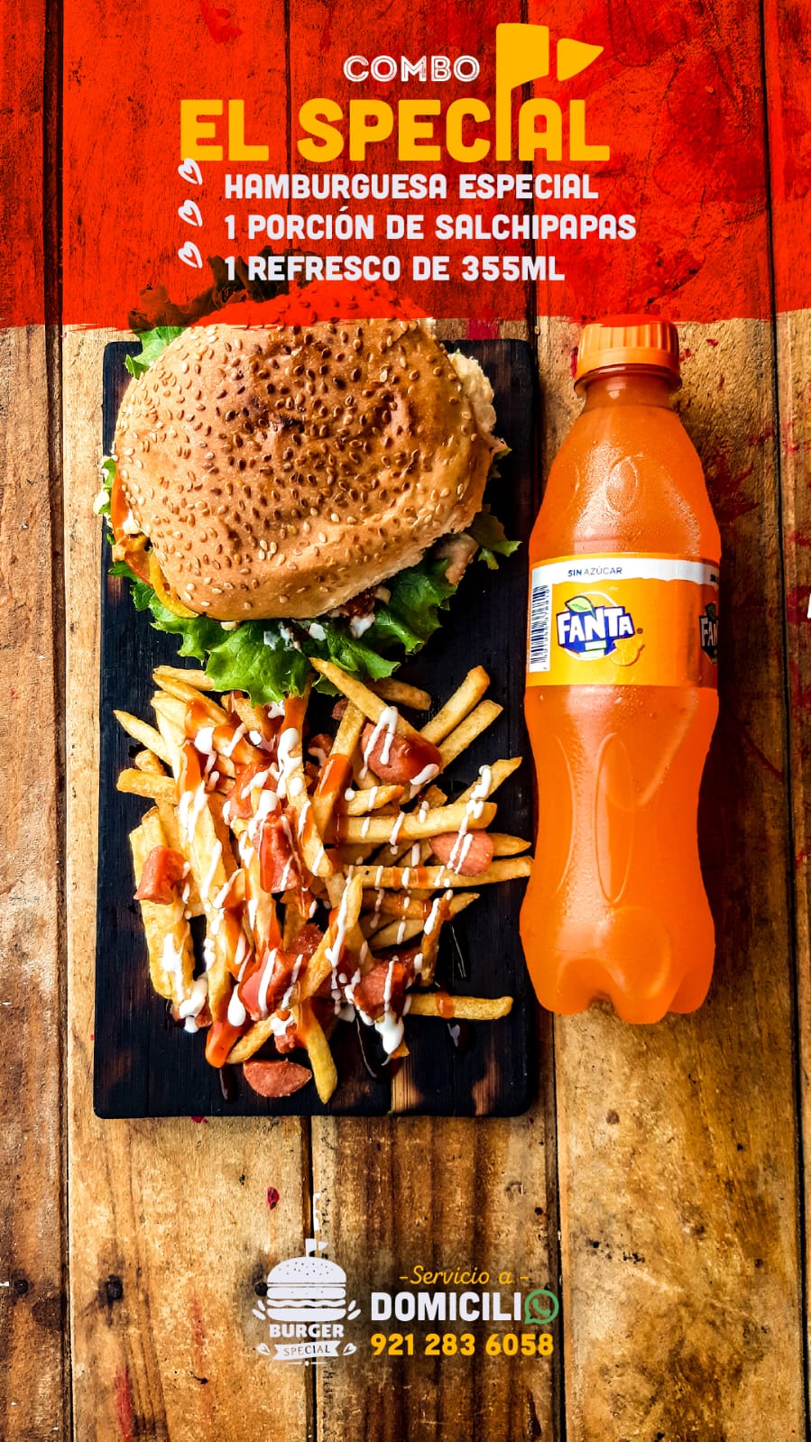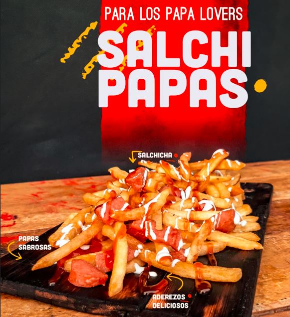 jamon, carne, queso, cebolla, salchicha para asar, tomate, piña, crema chimichurri y queso de hebra. Incluye una porción de salchipapas y refresco de 355 ml.