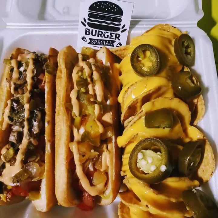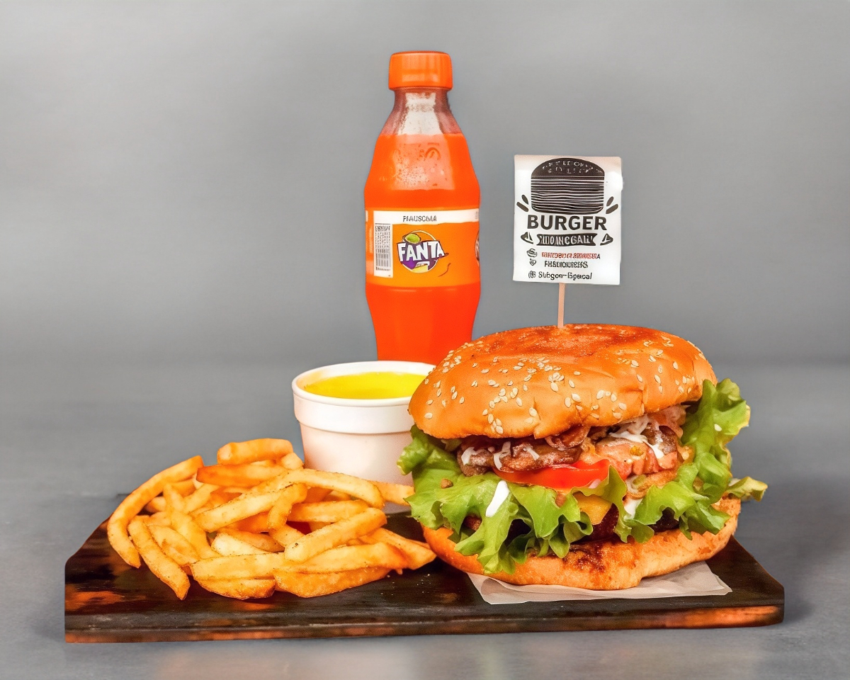 Hamburguesa doble carne, con especialidad a elegir, salchicha para asar o champiñones, incluye refresco de 355 ml y porcion de papas con queso para nachos.