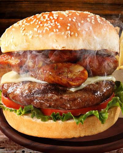 Carne de res asada al carbon, chistorra asada, pepinillos , cebolla, ketchup, mayonesa (no incluye tomate y lechuga)