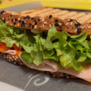 Sandwich con jamón de pavo y pechuga de pavo, lechuga, trozos de piña y queso manchego. Acompañado con Papas Chips.