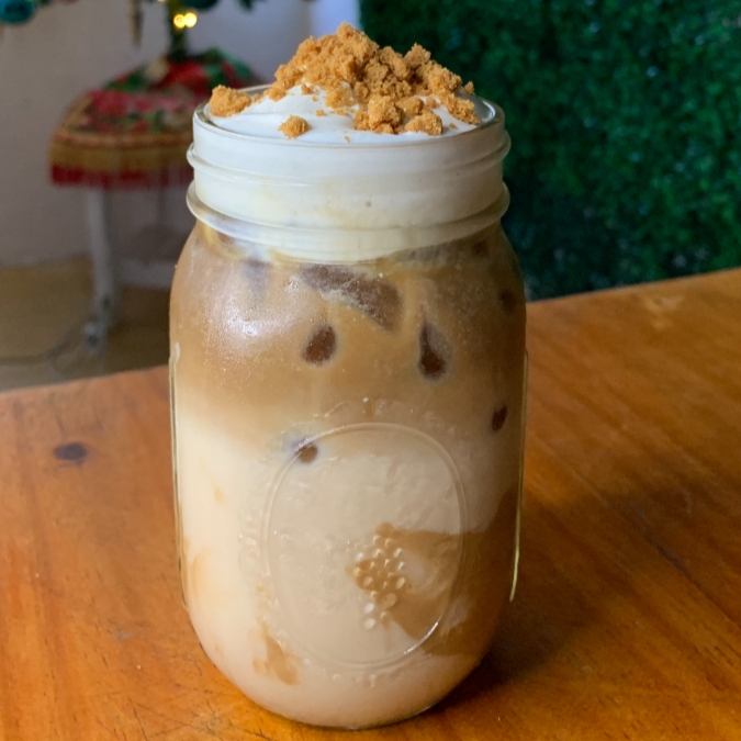 Delicioso latte frío, hecho a base de espresso,crema de mazapan, leche deslactosada, acompañado de coald foam con un toque de crumbl de mazapan autentica delicia a tu paladar, en vaso de 16 oz