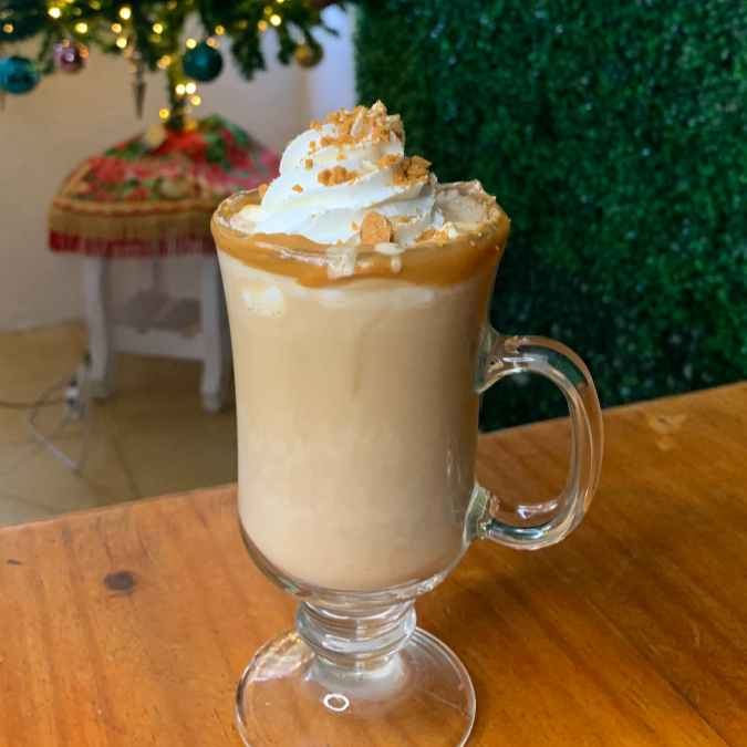 Delicioso latte calientito, hecho a base de espresso,crema de mazapan, leche deslactosada, con un toque de crumbl de mazapan autentica delicia a tu paladar