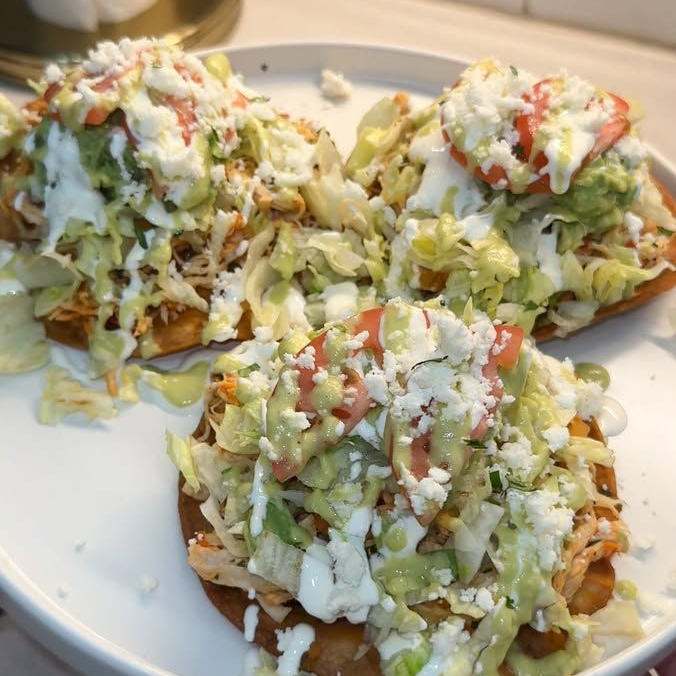 ORDEN DE 2 PIEZAS DE TOSTADAS, CUBIERTAS EN UNA CAMA DE FRIJOL Y MAYONESA, CON LA CARNE DE TU ELECCION, CUBIERTO DE LECHUGA, TOMATE, CEBOLLA, CREMA, QUESO Y SALSA ROJA