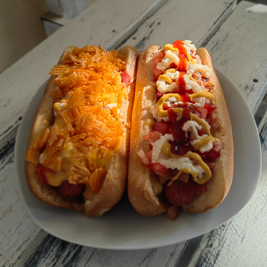 2 piezsas de hot dog que incluyen pan tradicional, Salchicha de pavo, cebolla caramelizada,tomate mayonesa, mostaza y catsup, tocino, queso para nachos y sabritas ruffles
