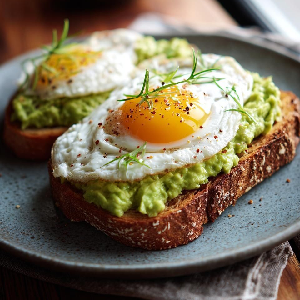 ORDEN DE DOS REBANADAS DE PAN TOSTADO ARTESANAL, CUBIERTO DE AGUACATE CREMOSO, CON UNA PIEZA DE HUEVO EN CADA UNO, SAZONADO CON PIMINETA, FINAS HIERBAS Y ACEITE DE OLIVA