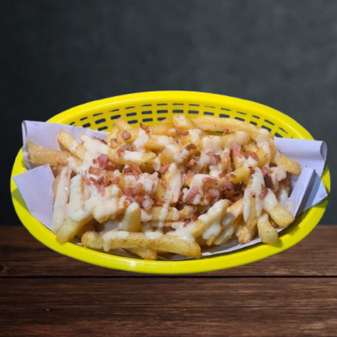 ¡Nuestras papas estrella! Sazonadas con el mix secreto de la casa, bañadas en una sedosa y cremosa salsa Alfredo y coronadas con trozos de tocino extra crujiente. Una explosión de sabor que no vas a querer compartir.