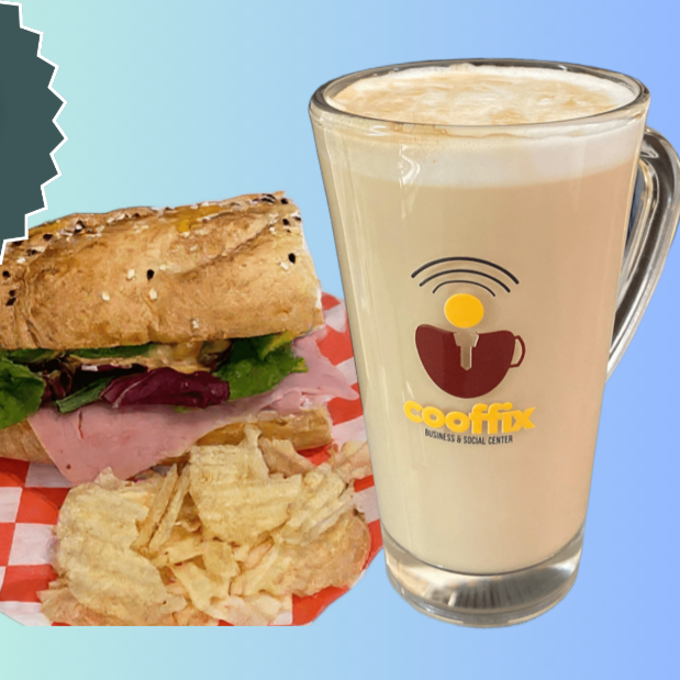 Incluye un croaissant, con jamon, tomate, verdura, quesos, aguacate y un cafe puede ser Latte, Americano, Capuchino.