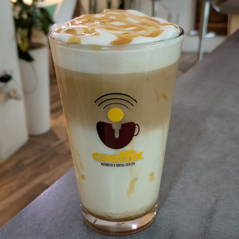 Caramel Macchiato decorado con caramelo, leche y cafe.