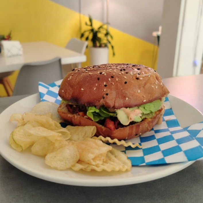 Hamburguesa de carne a elegir asada o pastor, cuatro quesos, lechuga, tomate, aguacate, cuatro quesos (Piña opcional) y aderezo de casa.