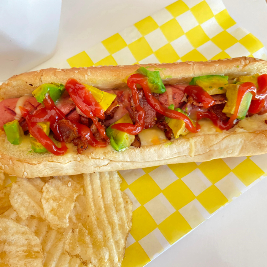 Hot Dog con Salchicha de Pavo asada con Aceite aguacate, tocino, 4 quesos, aderezo chipotle, Kétchup,tomate cherry y trozos de aguacate
