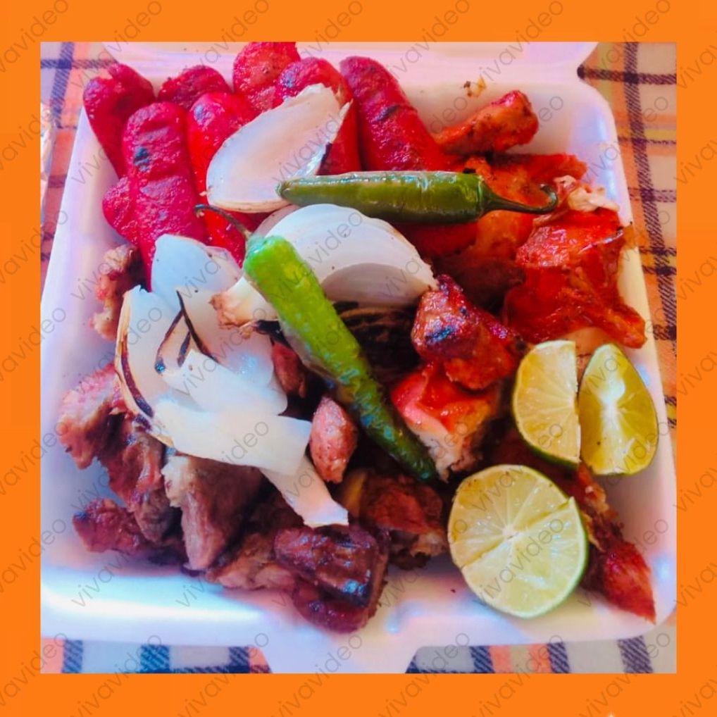 1/4 de pollo asado (A disponibilidad para enviar ya sea pechuga mas ala ó muslo mas pierna), 125 Gr aprox. de costilla asada, porción de arroz, chile jalapeño asado, tortillas y salsa.