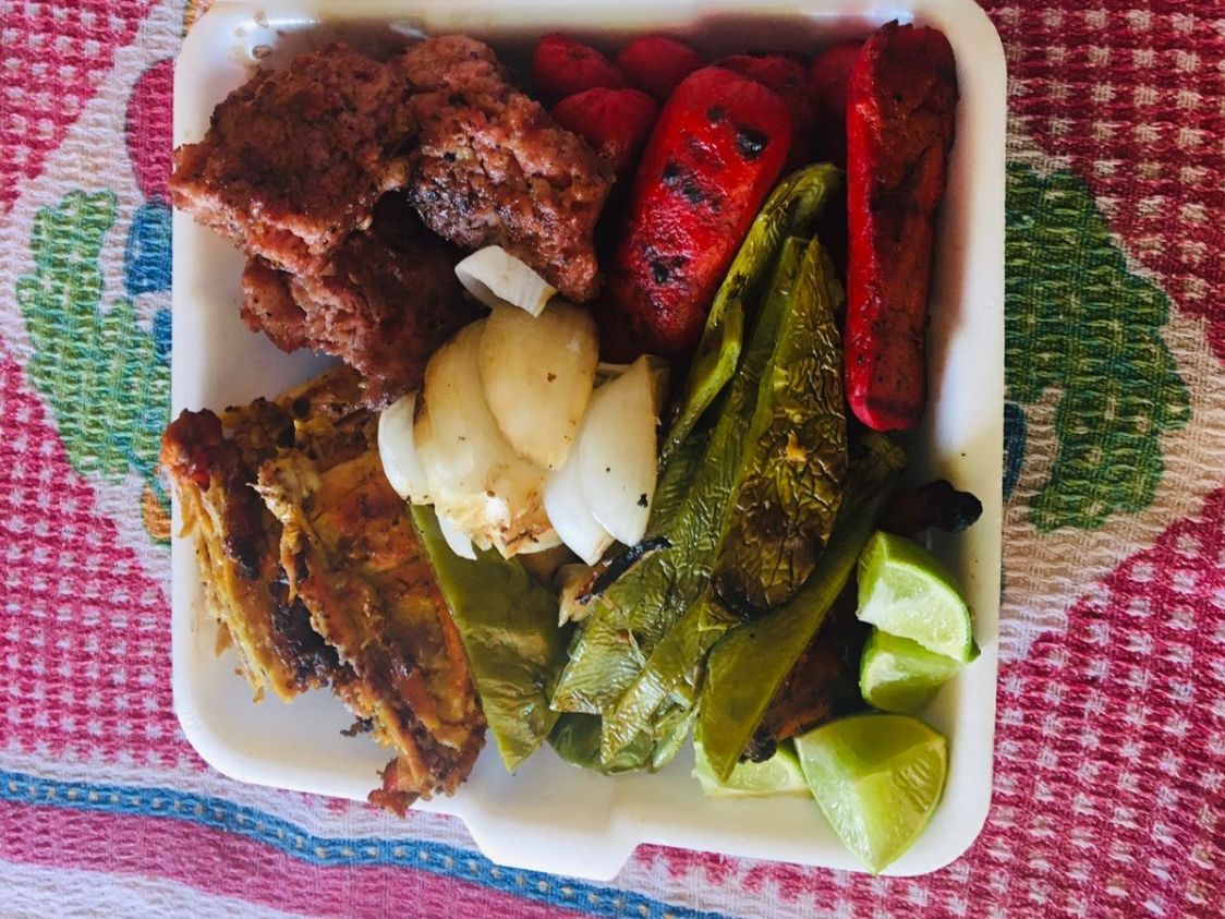 1/4 de pollo asado (A disponibilidad para enviar ya sea pechuga mas ala ó muslo mas pierna), 2 chorizos argentinos, porción de arroz, chile jalapeño asado, tortillas y salsa.