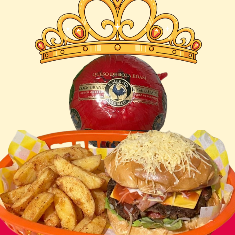130 Gr. carne de sirloin, acompañada con queso de bola, queso amarillo, jamon, tomate, lechuga, cebolla., pan brioche, 120 gr. papas fritas