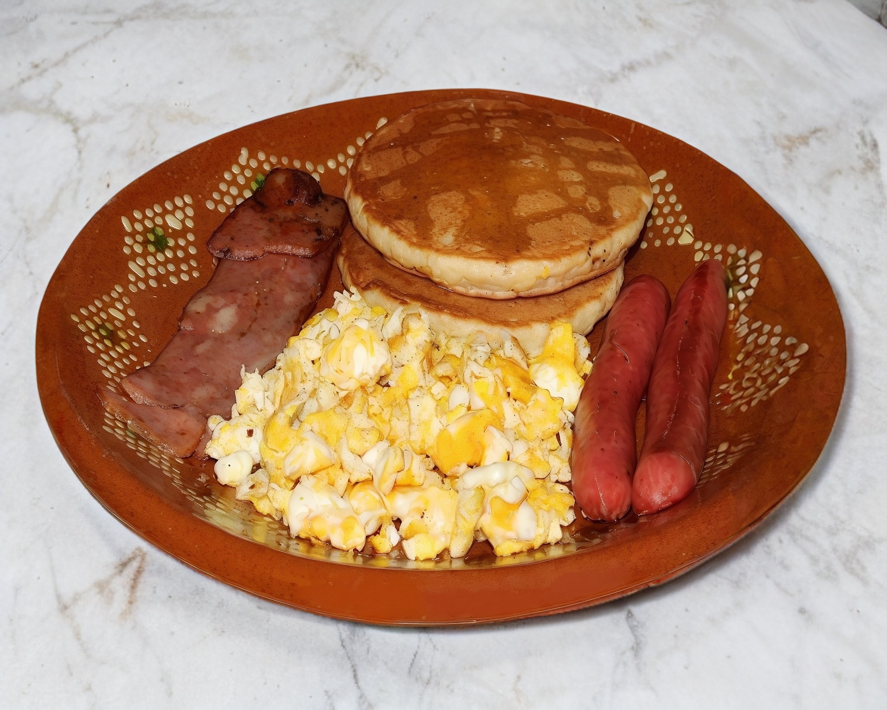 2 Hot cakes, 2 huevos estrellados o revueltos, 1 salchicha, 1 tocino y 1 café.