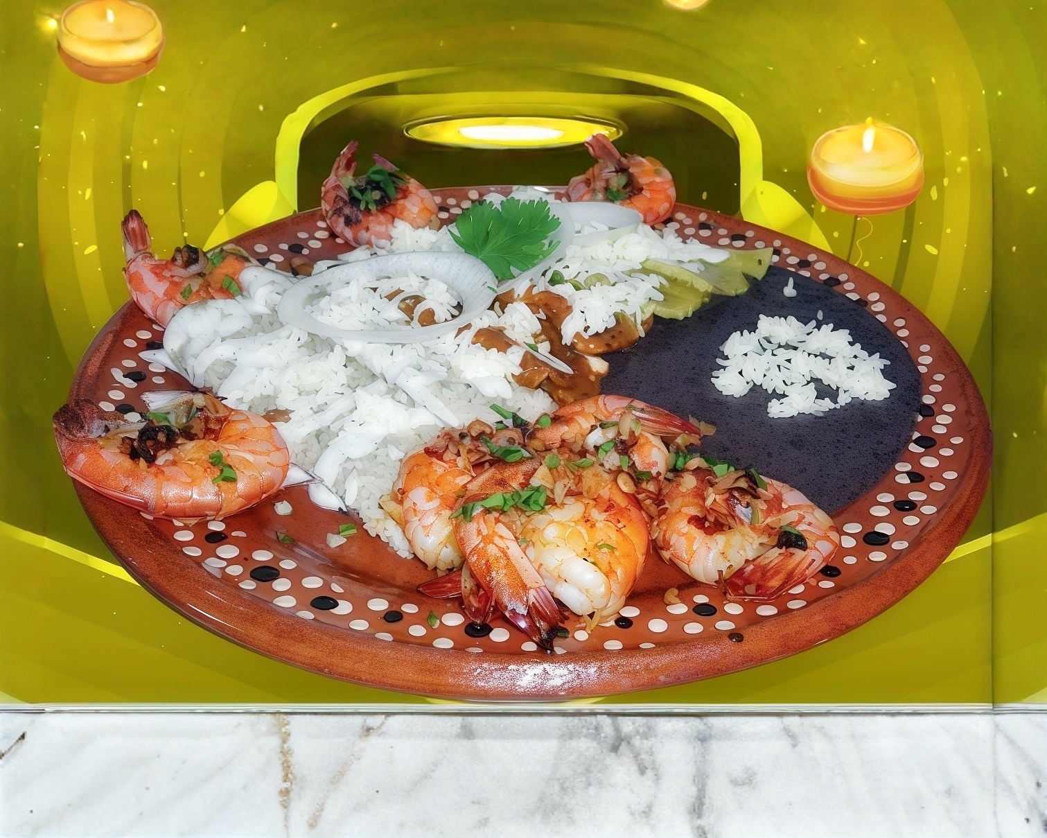 Camarones o Arrachera*1 + Porcion de Frijoles*1 + 10 Enchiladas Sencillas*1