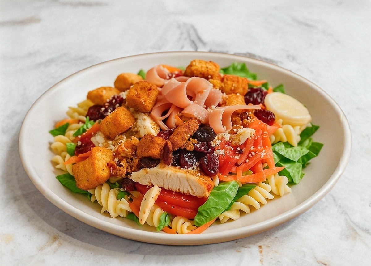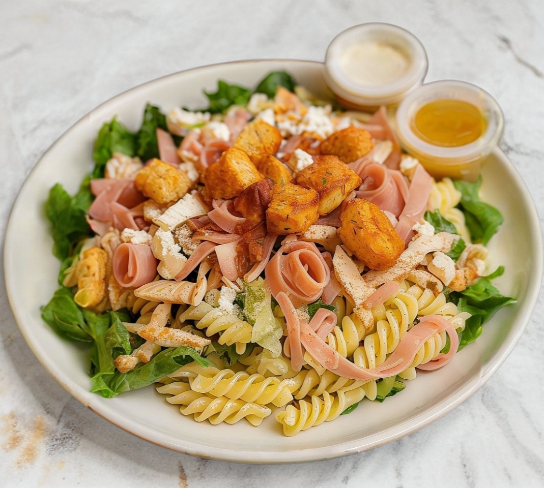 Lechuga, pepino, pasta, pechuga asada, tocino, jamon de pavo, queso fresco.