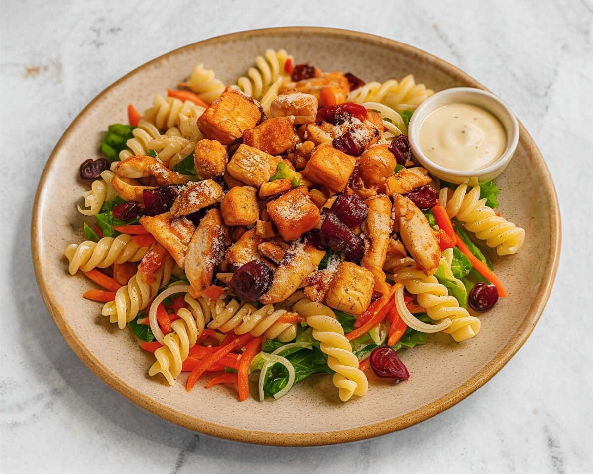 lechuga, pepino, zanahoria, pasta, parmesano, trozos de pechuga empanizada bañados en salsa bbq.