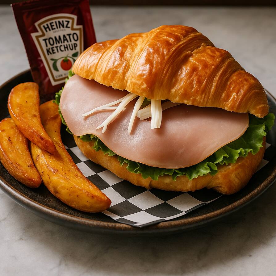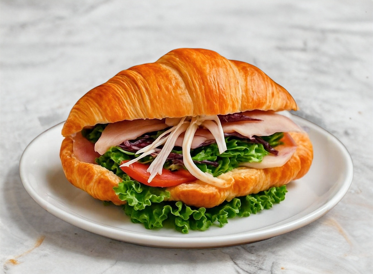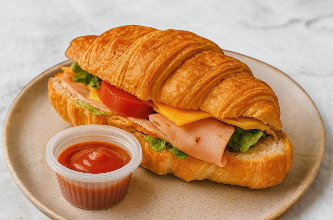 Cuernito relleno de jamon, queso amarillo, tocino, lechuga, cebolla, tomate y mayonesa.