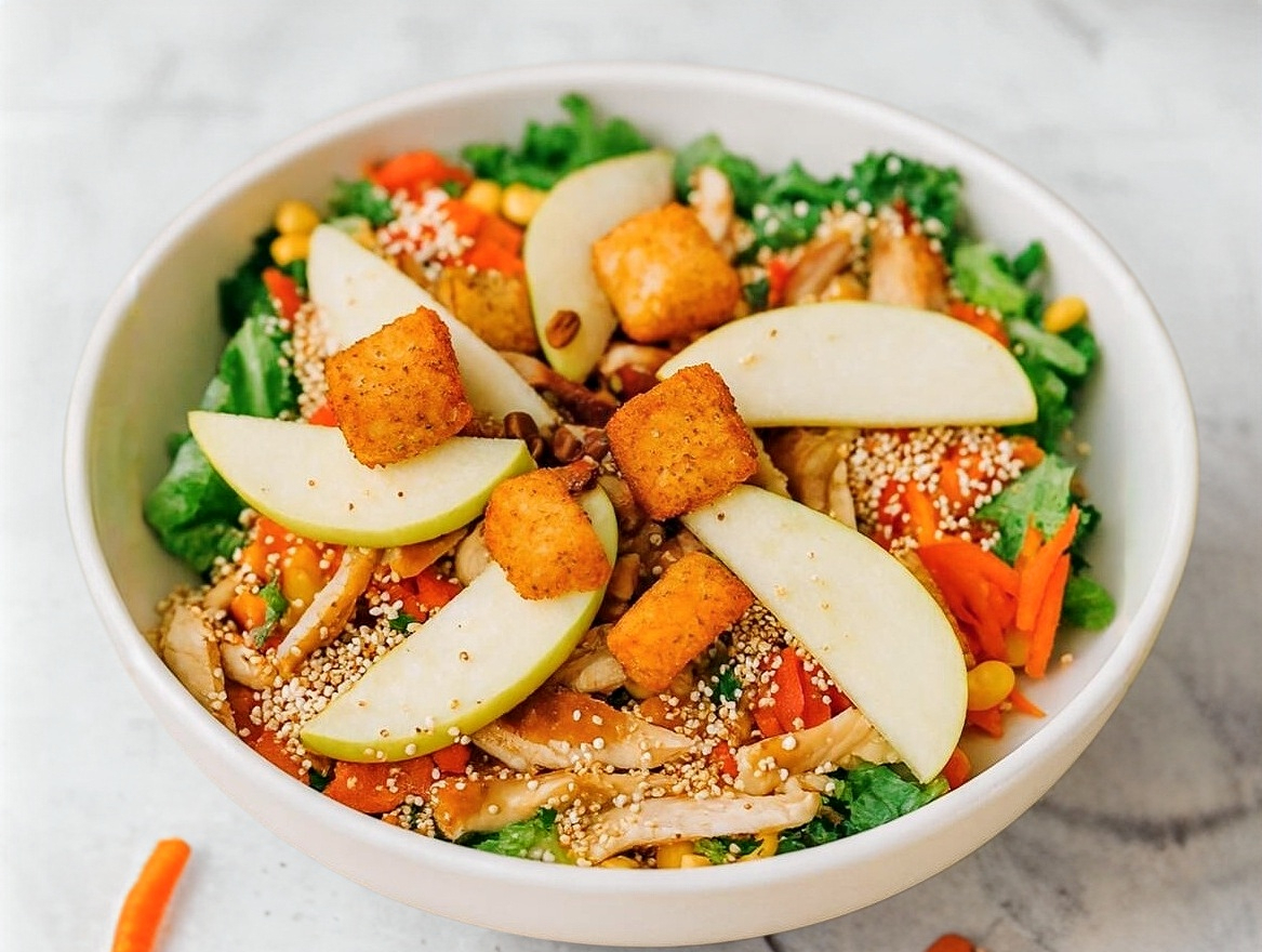 Lechuga, pepino, manzana, col morada, pechuga asada, arroz, nuez, parmesano.