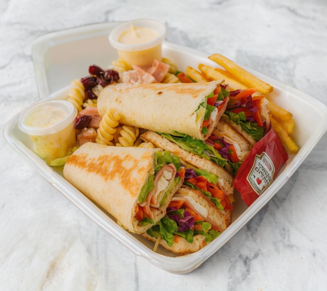 Combo especial que incluye: sandwich, burrito, ensalada sencilla y papas a la francesa.