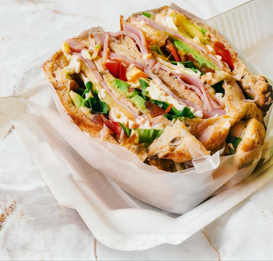 3 piezas de pan de caja integral, jamón de pavo, queso Oaxaca, col morada, lechuga, zanahoria, tomate, cebolla, pimiento, aguacate, ensalada california (sin pollo)y mayonesa.