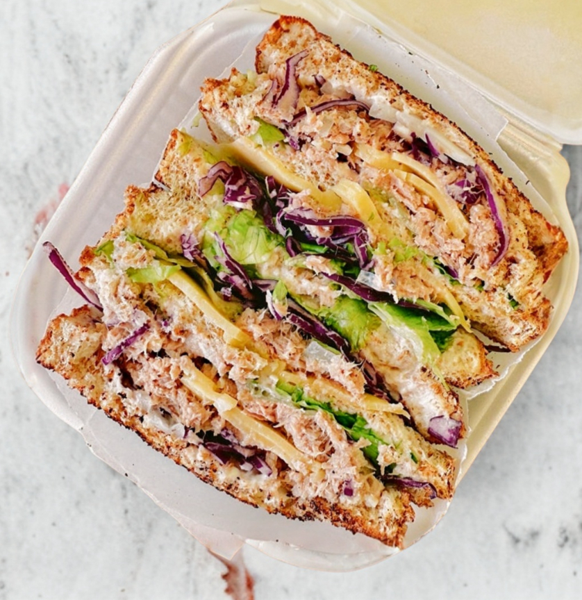 3 piezas de pan de caja integral, atun , aderezo chipotle, lechuga, col morada, cebolla, queso manchego y mayonesa.