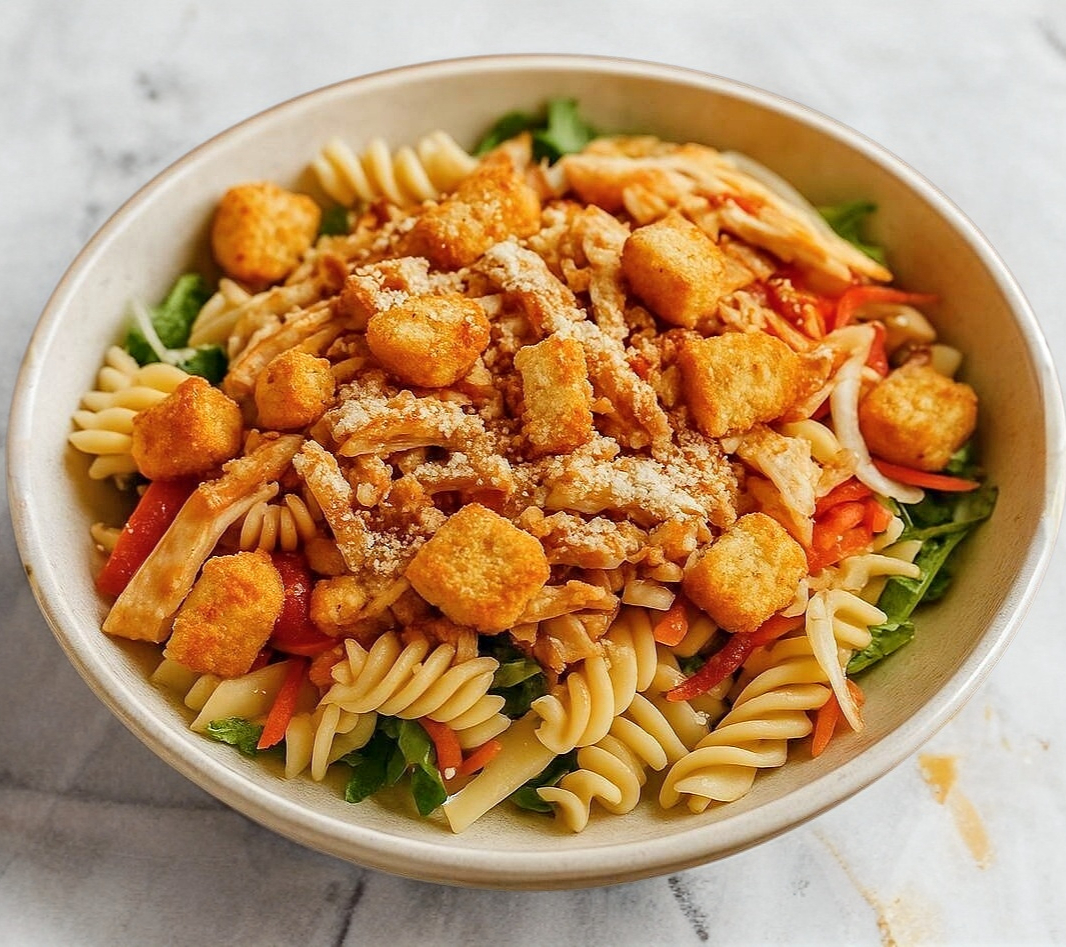 Lechuga, pepino, zanahoria, pasta, pechuga asada, salsa de soya, cacahuate, parmesano