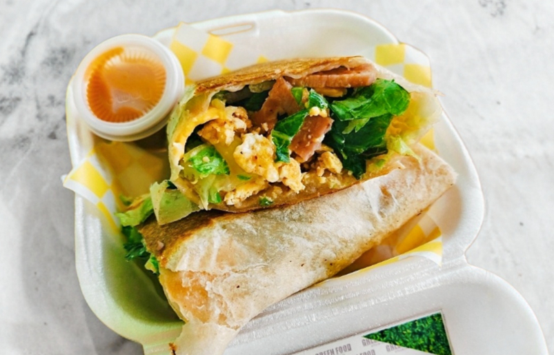 Burrito de tortilla de harina relleno de huevo revuelto, queso amarillo, lechuga, tocino, cebolla, pimiento.