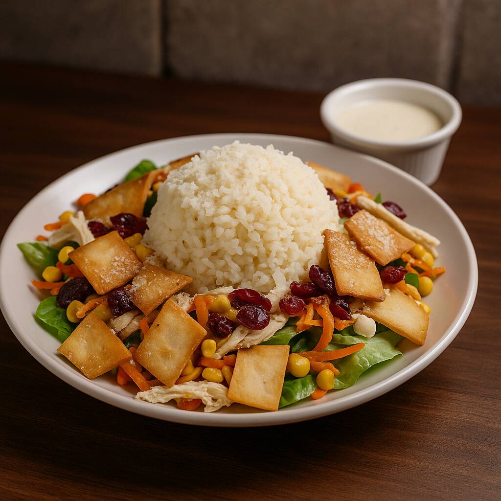 Lechuga, zanahoria, pepino, elote, pechuga asada, arroz, parmesano, arándano.