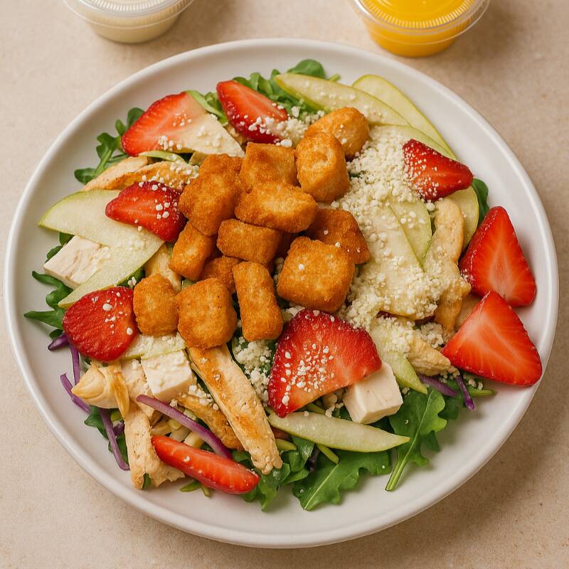 Lechuga, pepino, manzana, col morada, fresa, queso philadelphia, pechuga asada, cacahuate, parmesano.