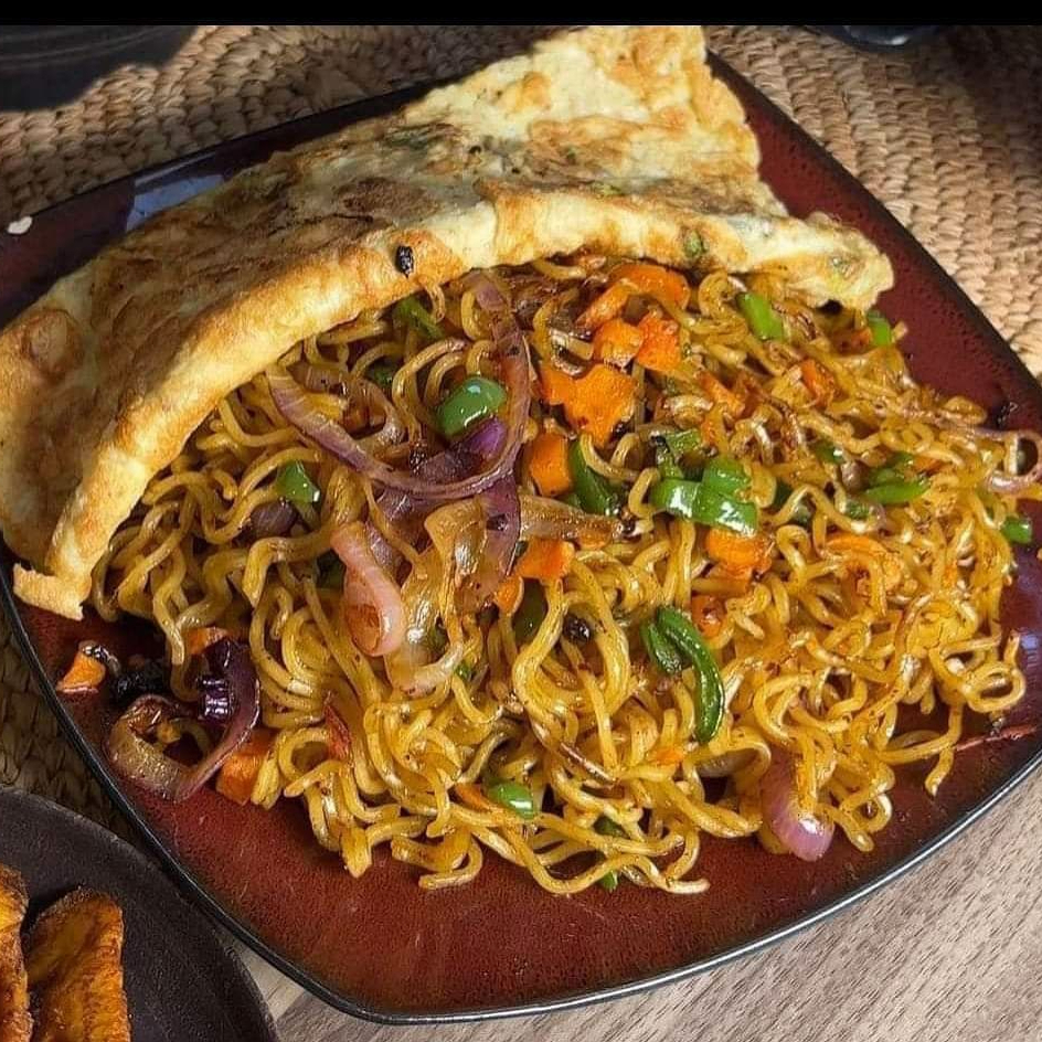 Ramen frito estilo africano con vegetales, huevo frito y salchicha.