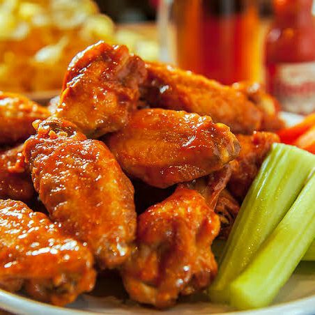 10 Piezas de alitas de pollo marinadas, con salsa BBQ, o habanero, acompañadas de aderezo ranch o queso.