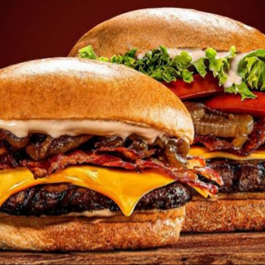 3 Hamburguesas, 1 aros de cebolla, 2 papas y 3 refrescos (600 ml).