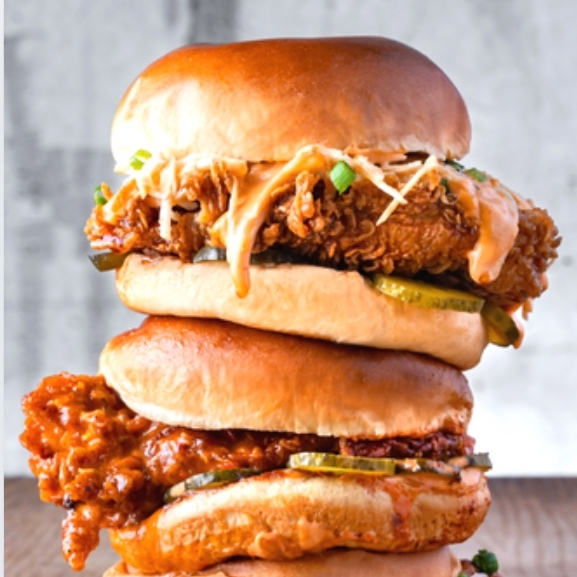 150g Crispy chicken, lechuga crujiente, tomate, cebolla, jalapeño y aderezo.