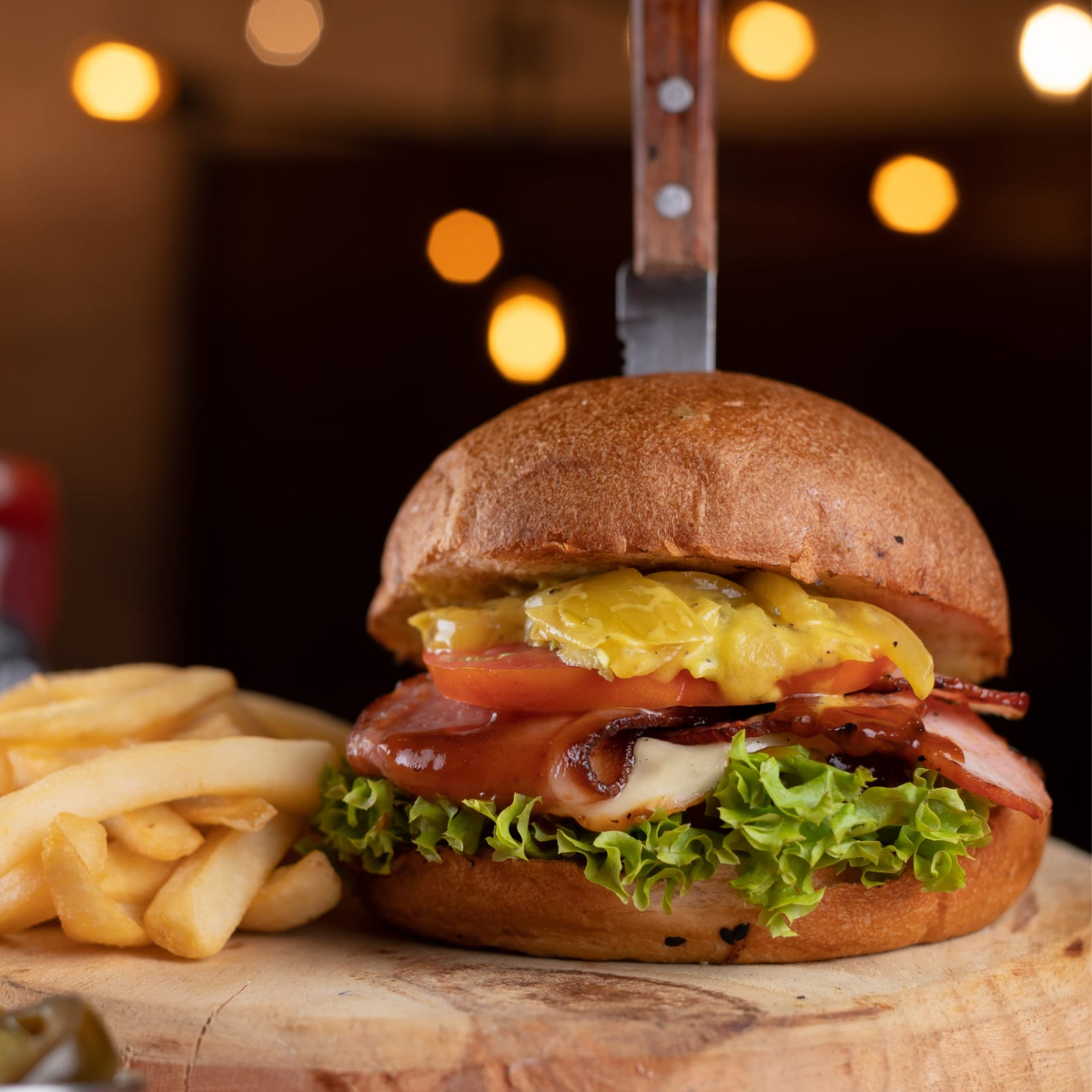 2 CARNES DE RES 1/3 DE LB CADA UNA 60 G DE TOCINO AHUMADO , QUESO AMERICANO , LECHUGA ITALIANA , TOMATE , CEBOLLA ASADA , AGUACATE , MAYONESA