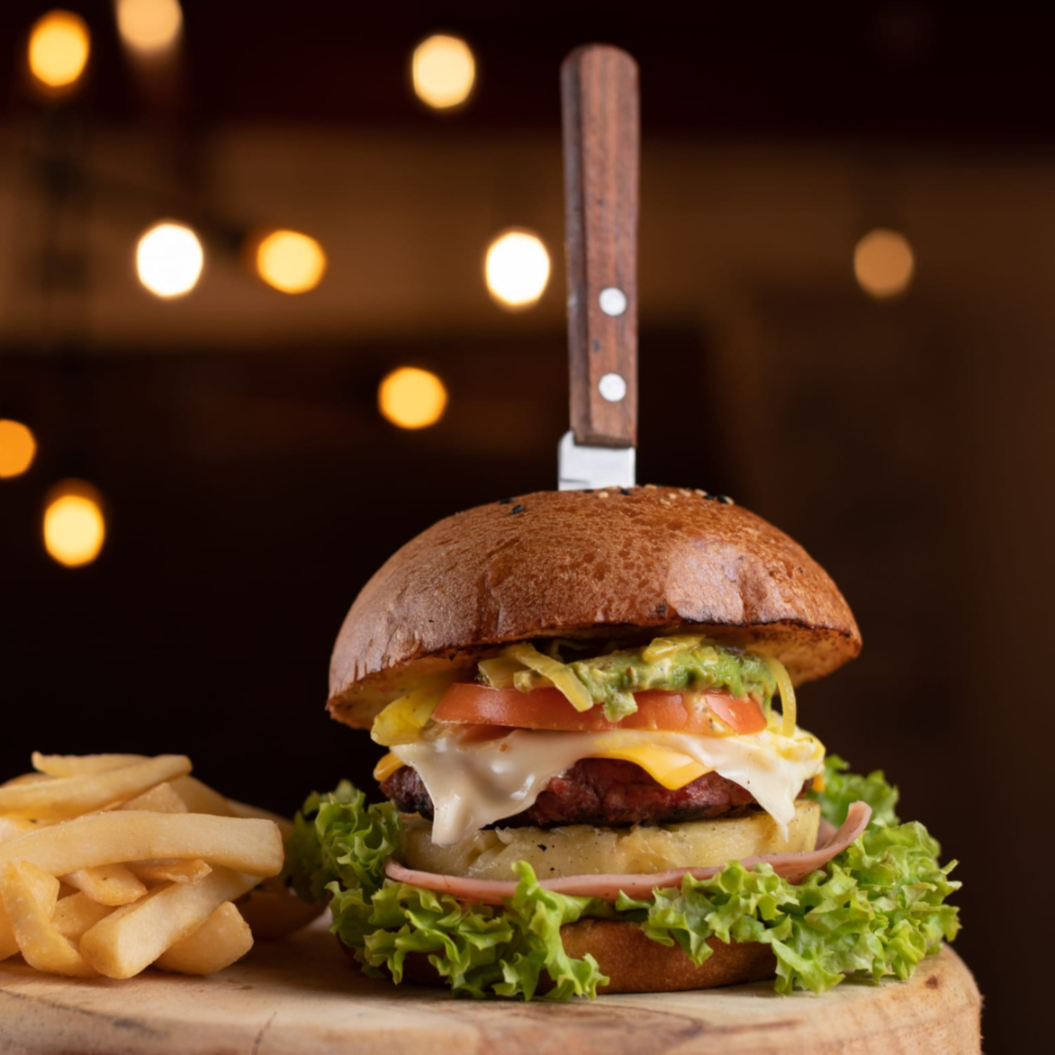 1/3 LB DE CARNE DE RES ,40 G JAMON , 40 G DE TOCINO AHUMADO , 40G DE PIÑA ASADA , QUESO AMERICANO , LECHUGA ITALIANA , TOMATE , AGUACATE , CEBOLLA ASADA , MAYONESA