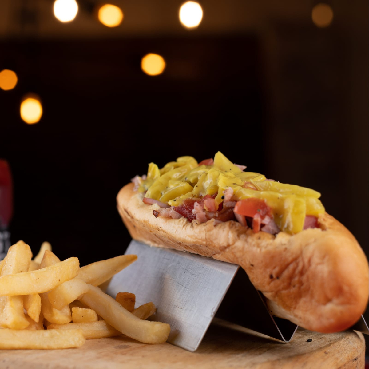SALCHICHA JUMBO , 40 G DE TOCINO AHUMADO , CEBOLLA ASADA , TOMATE , MAYONESA , PAN ARTESANAL