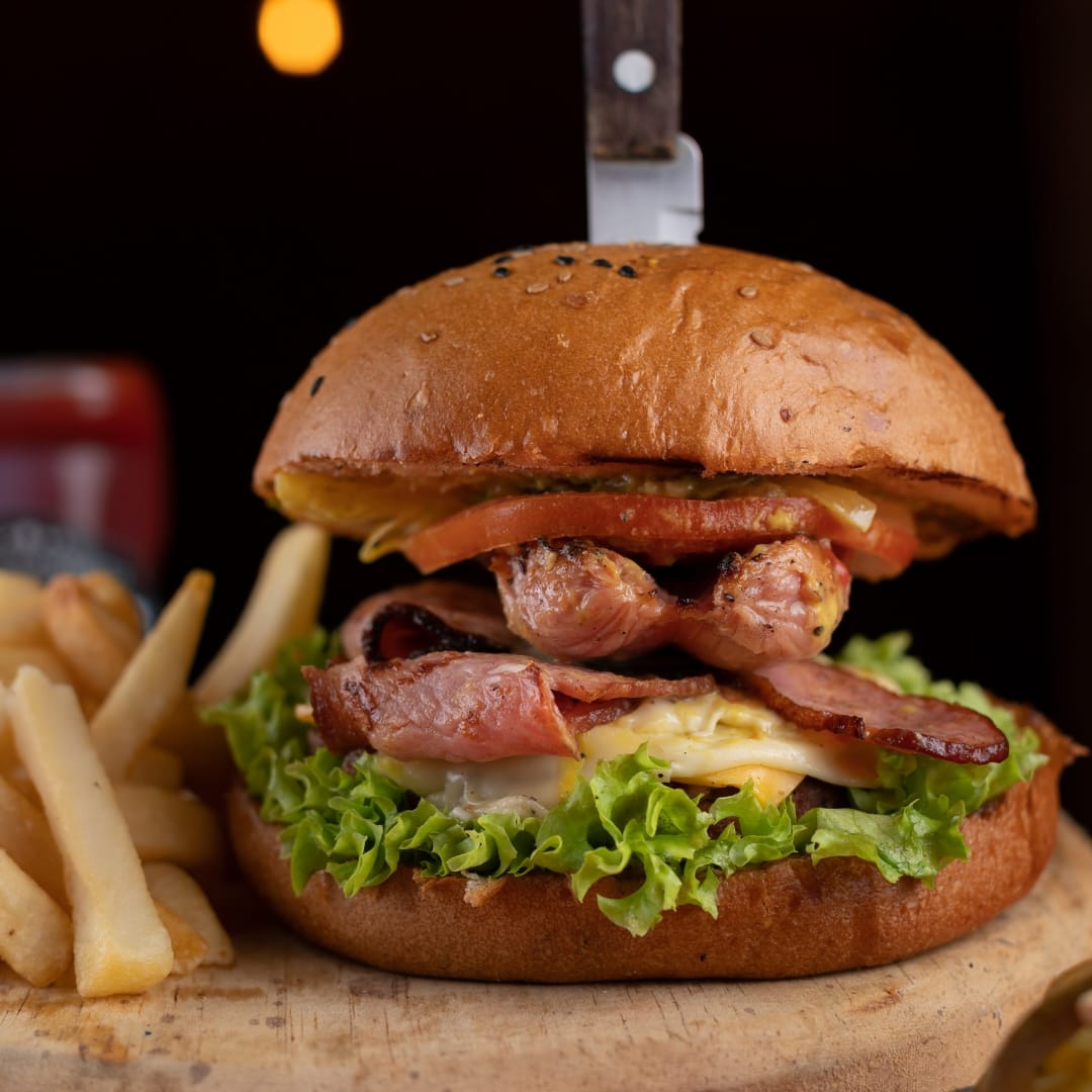1/3 LB DE CARNE DE RES 40G DE CHORIZO ARGENTINO 40G DE TOCINO AHUMADO , QUESO AMERICANO , LECHUGA ITALIANA , TOMATE , AGUACATE , CEBOLLA ASADA , MAYONESA