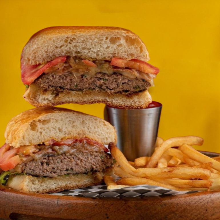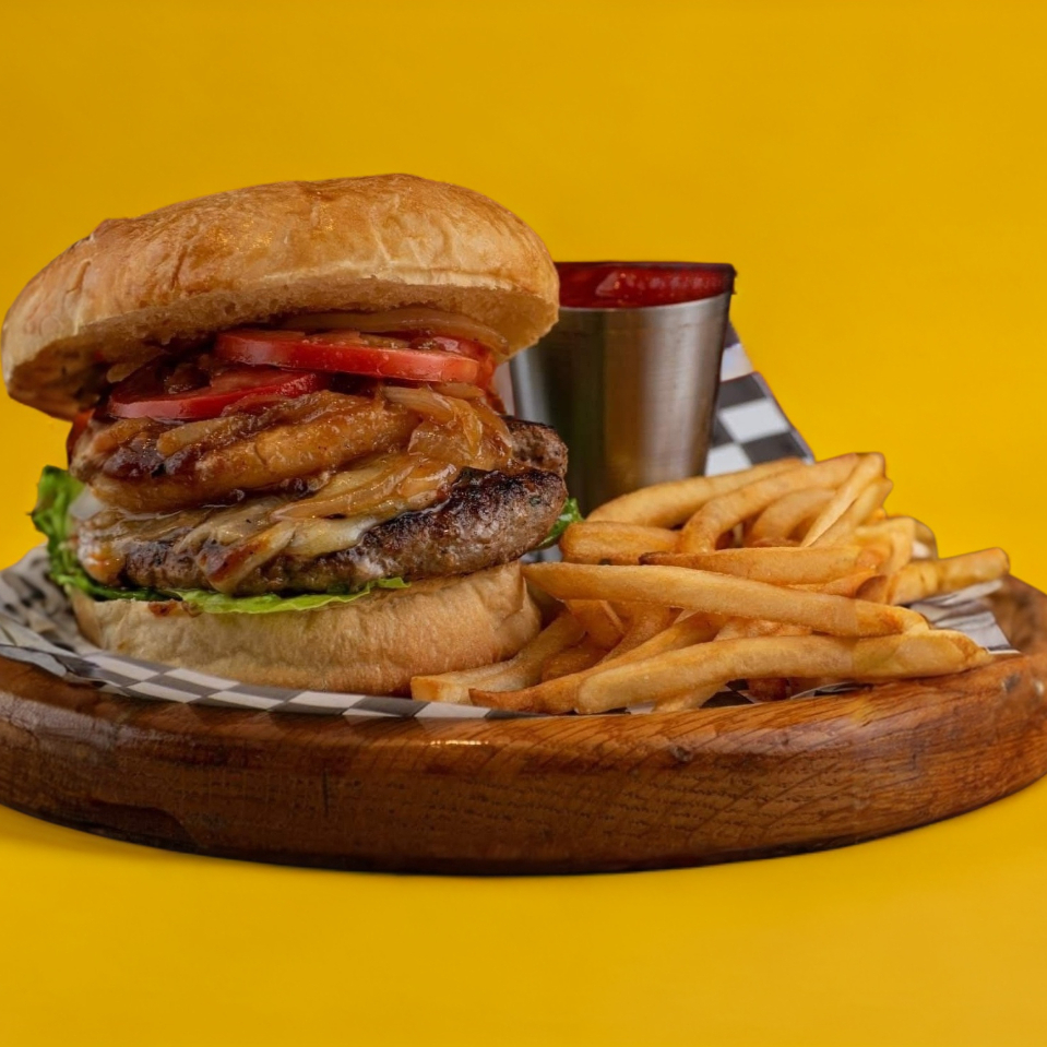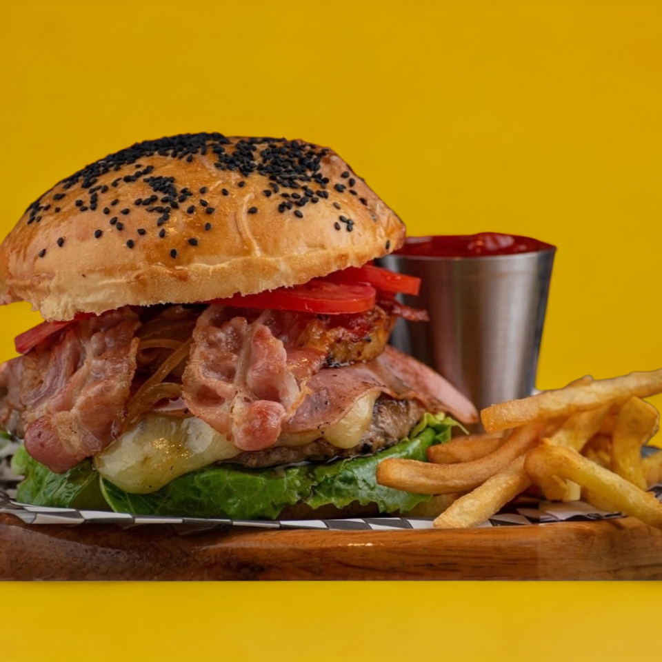 200 grs. De carne, pan artesanal, queso gouda, tiras de tocino, cebolla caramelizada, vegetales y aderezos. Incluye papas a la francesa.