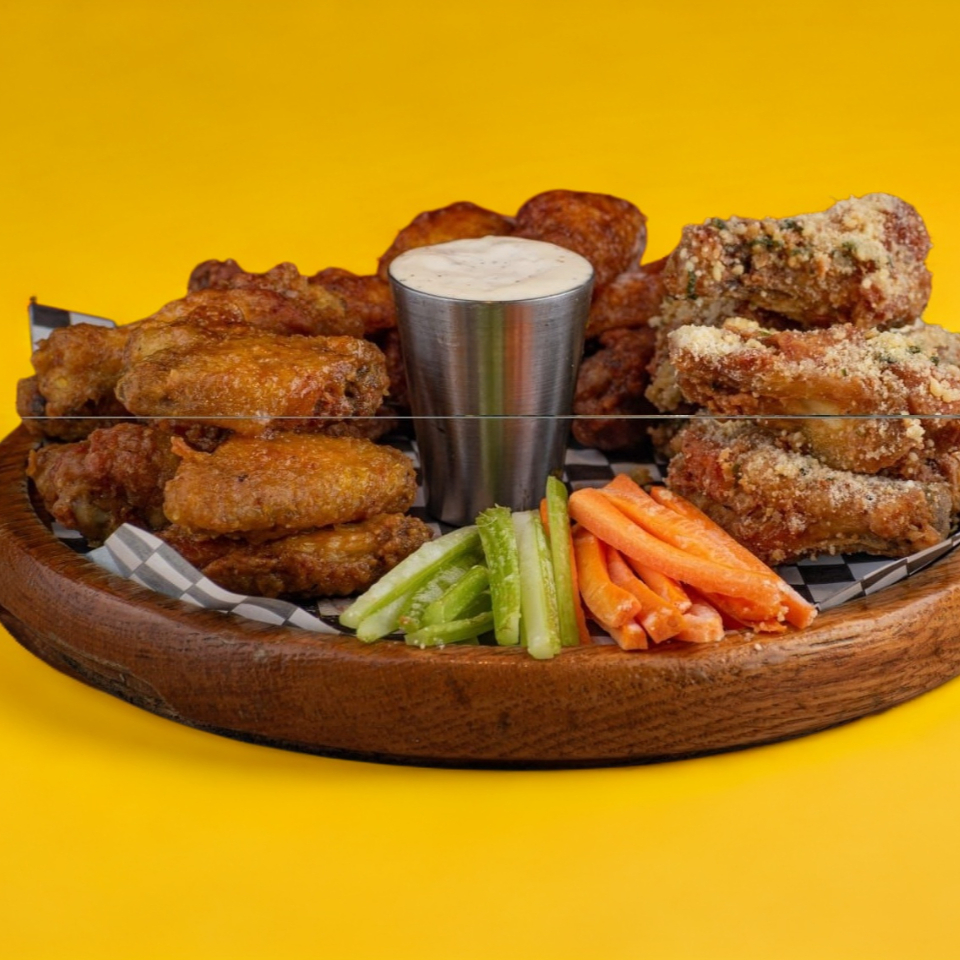 Trozos de boneless, queso para nachos, ranch, perejil y salsa a elegir.