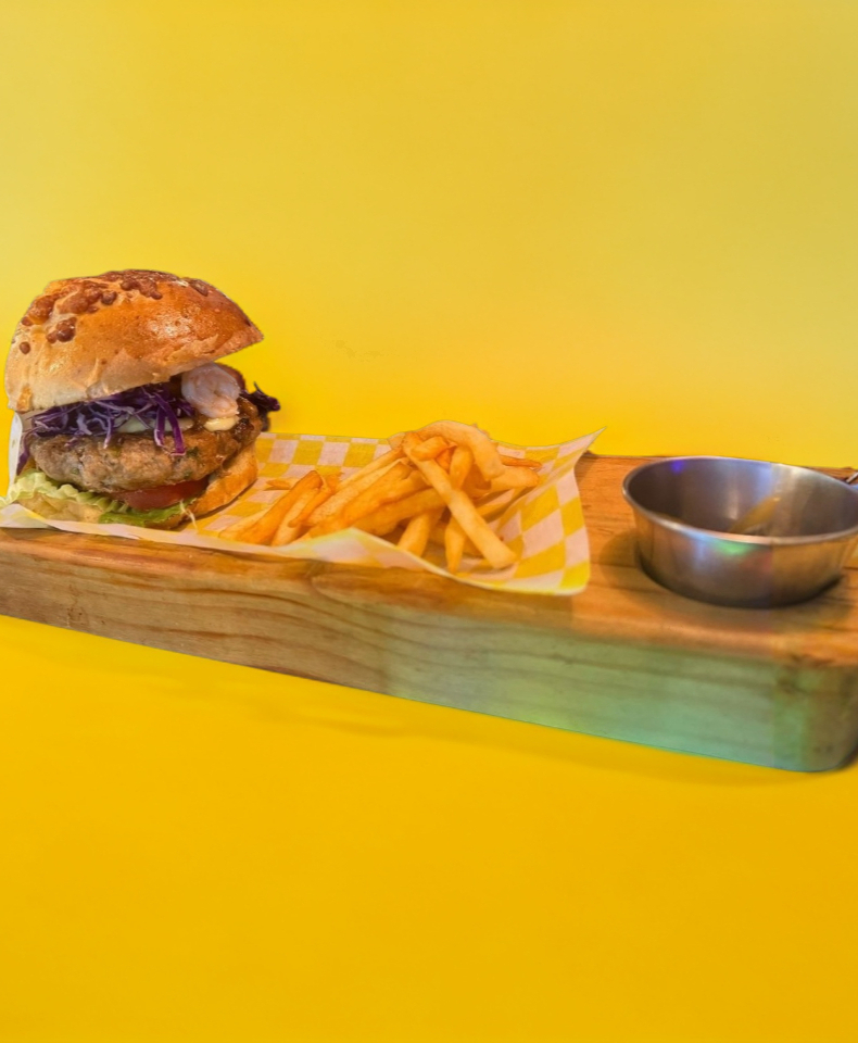 200 grs. De carne, pan artesanal, queso gouda, camarones condimentados, cebolla morada, col morada, vegetales y aderezos. Incluye papas a la francesa.