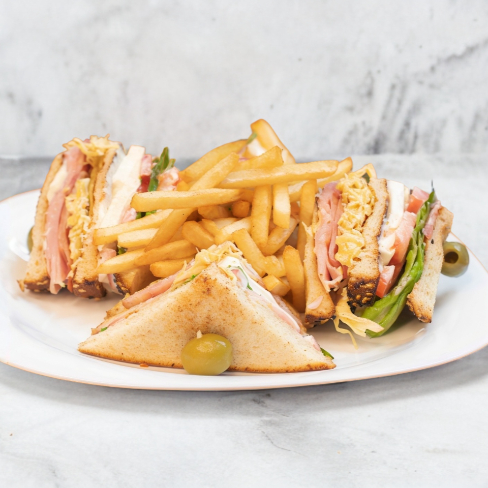 Jamón, pollo, tocino, lechuga, tomate y papas a la francesa.
