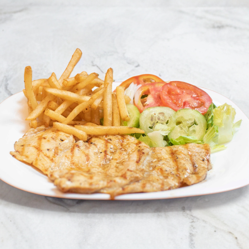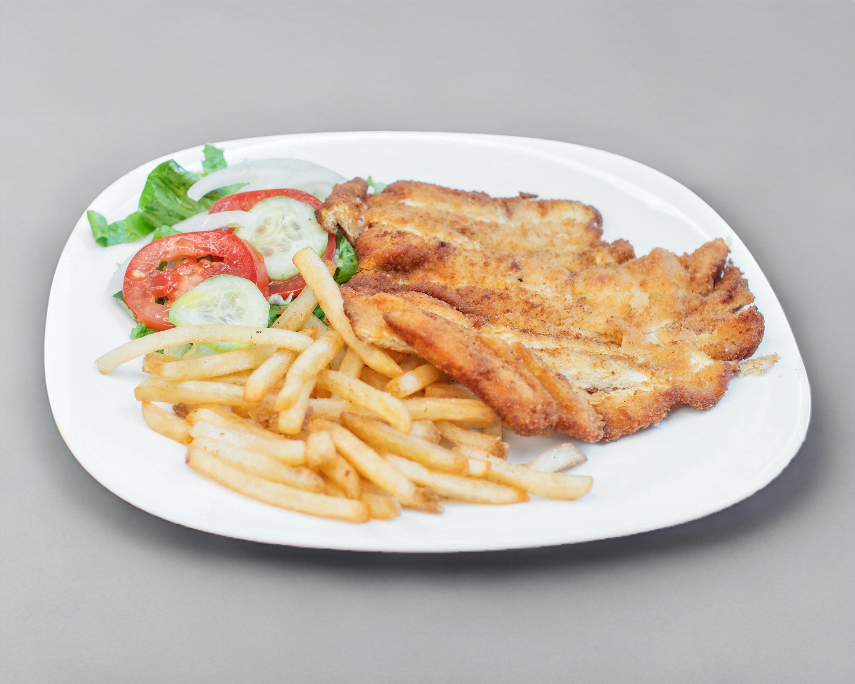 Pollo empanizado en tiras, acompañado de papas a la francesa y ensalada.