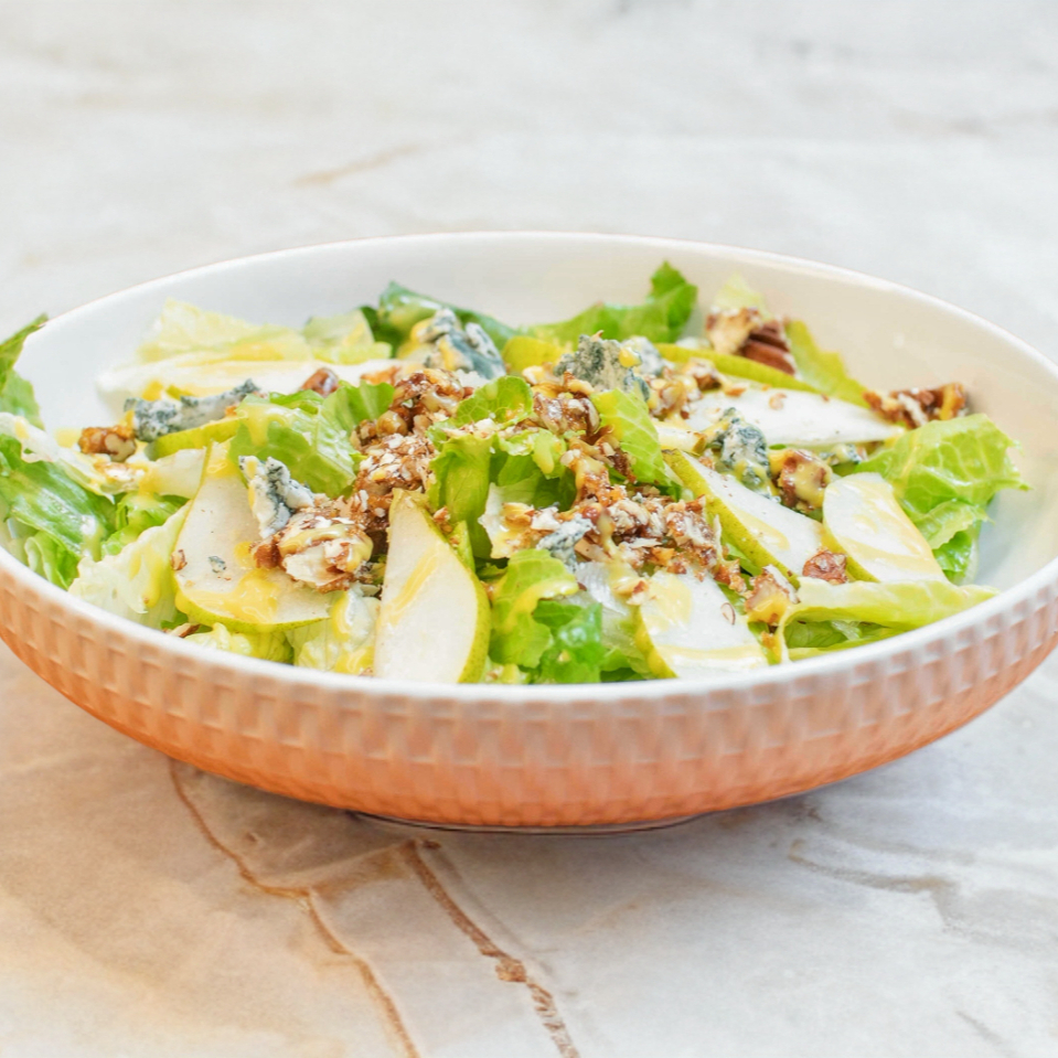 Lechuga fresca acompañada de pollo al grill, crutones y aderezo césar.