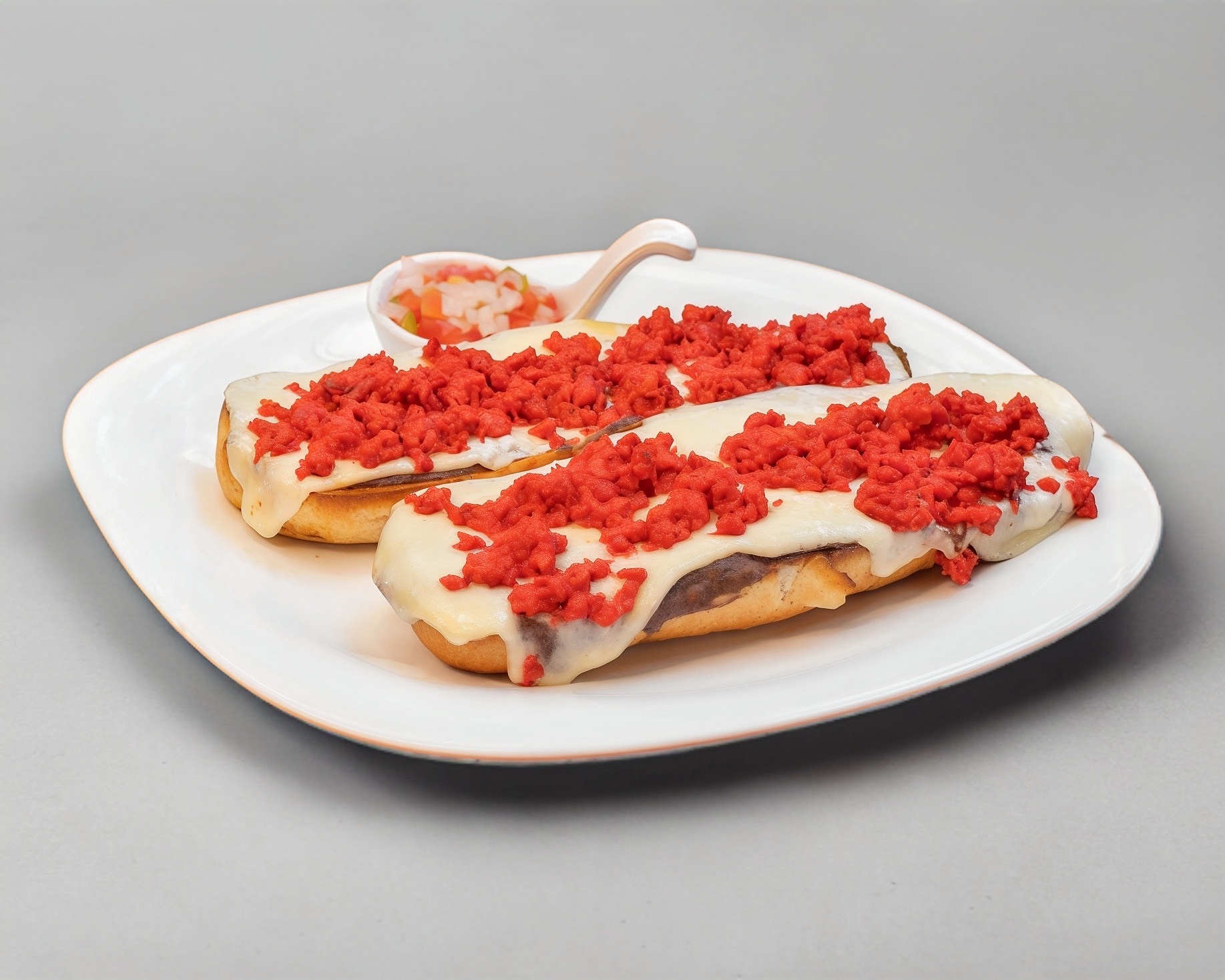 Con frijoles refritos, arrachera, gratinados con queso gouda y pico de gallo.