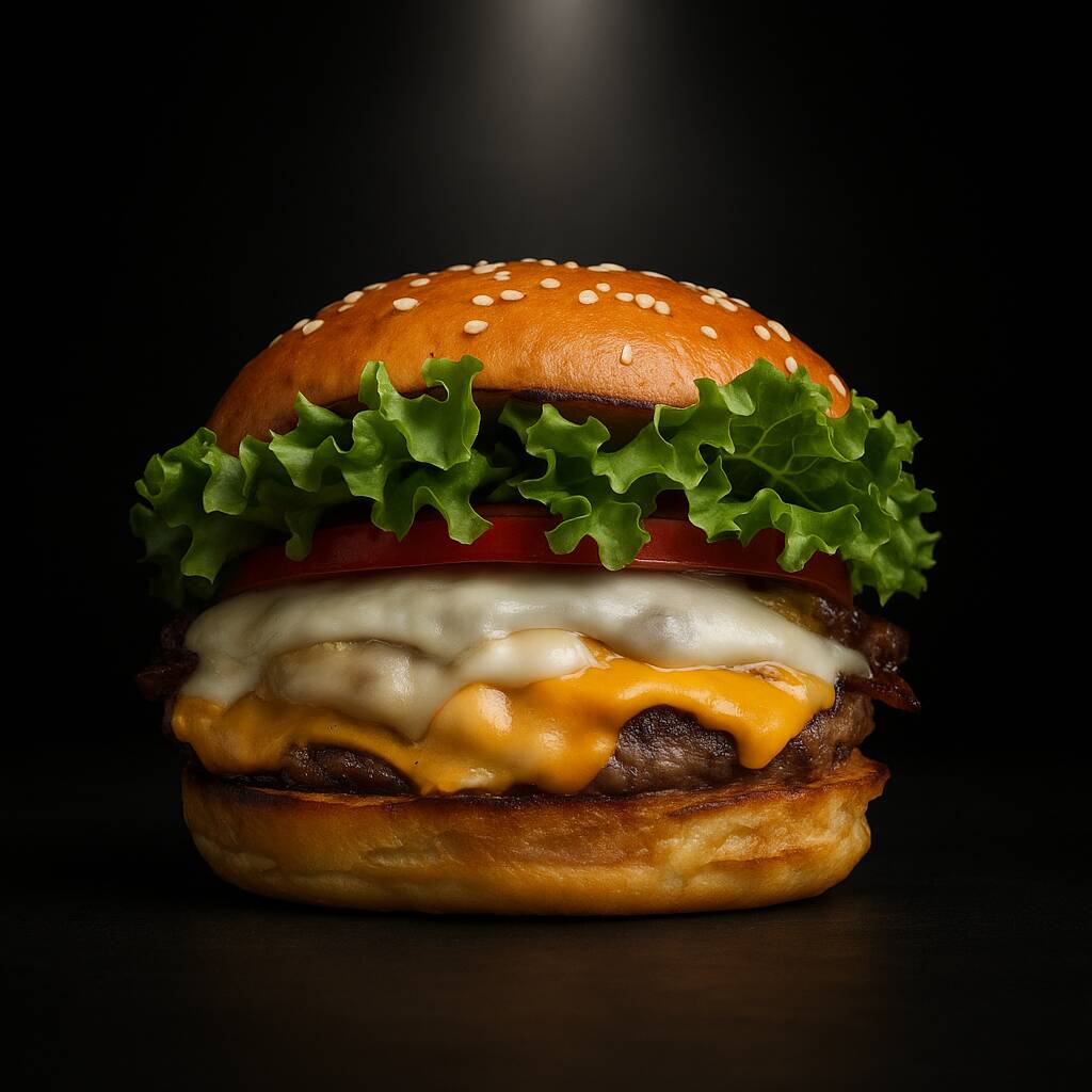 Tocino con mucha carne y carne de 1/2 libra, doble queso cheddar, lechuga francesa, tomates frescos y cebolla.